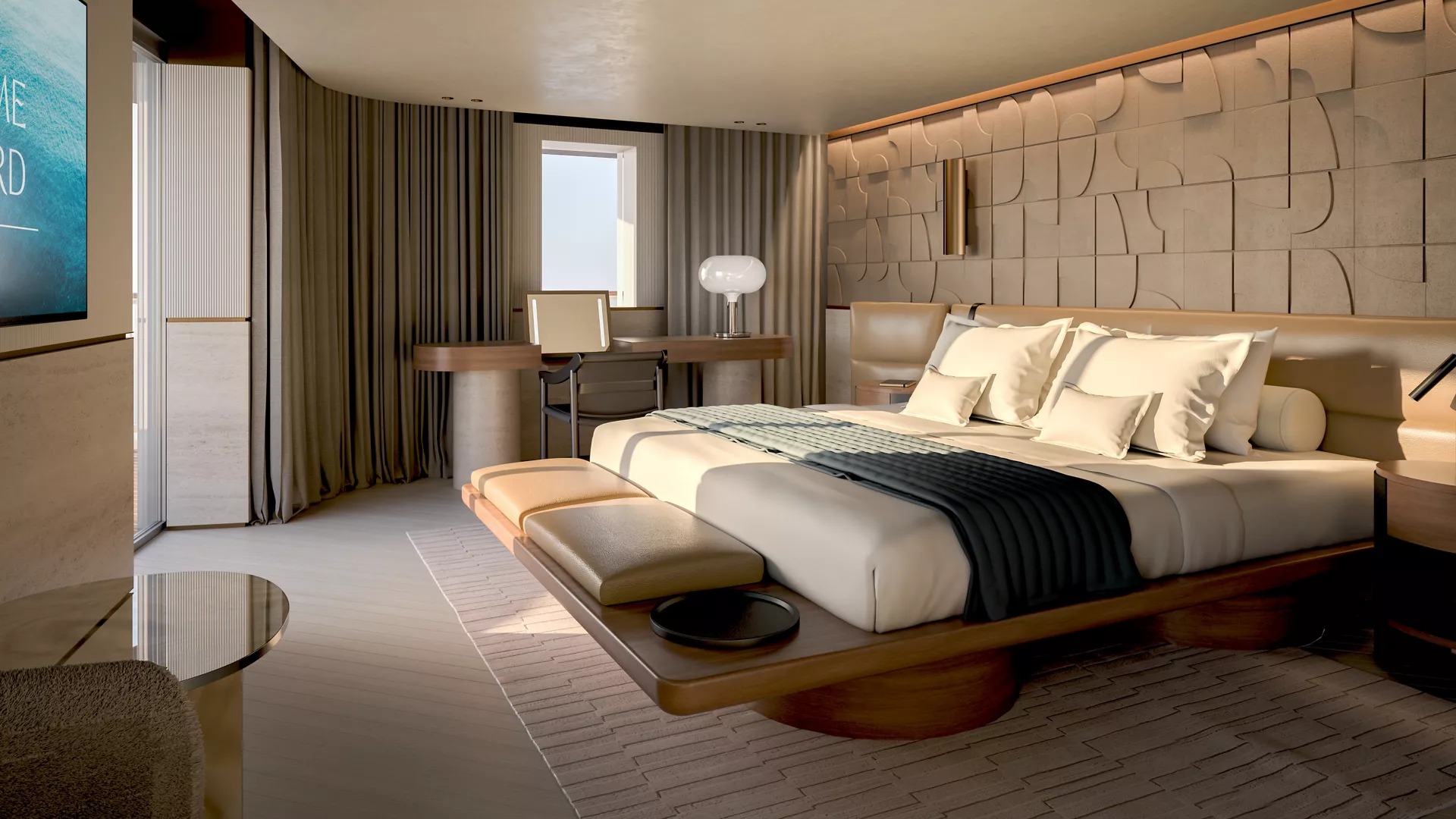 Ispirata a una sensibilità mediterranea, la lussuosa sistemazione combina toni caldi, materiali naturali e artigianalità d’eccellenza, con arredi iconici di Cassina, Moroso e Kettal, molti dei quali disegnati dalla stessa Urquiola. Bronzi, marmi Cipollino e Travertino, legni scanalati e tessuti morbidi dialogano con la luce naturale in una composizione fluida e armoniosa. Gli spazi, dalla camera con bagno in marmo e area wellness fino alla grande terrazza con idromassaggio e zona dining all’aperto, sono pensati per essere vissuti senza fretta. Completata da un servizio di maggiordomo dedicato, l’Owner’s Residence by Patricia Urquiola rappresenta una nuova idea di lusso in mare, dove design, benessere e paesaggio si fondono in un’unica esperienza.